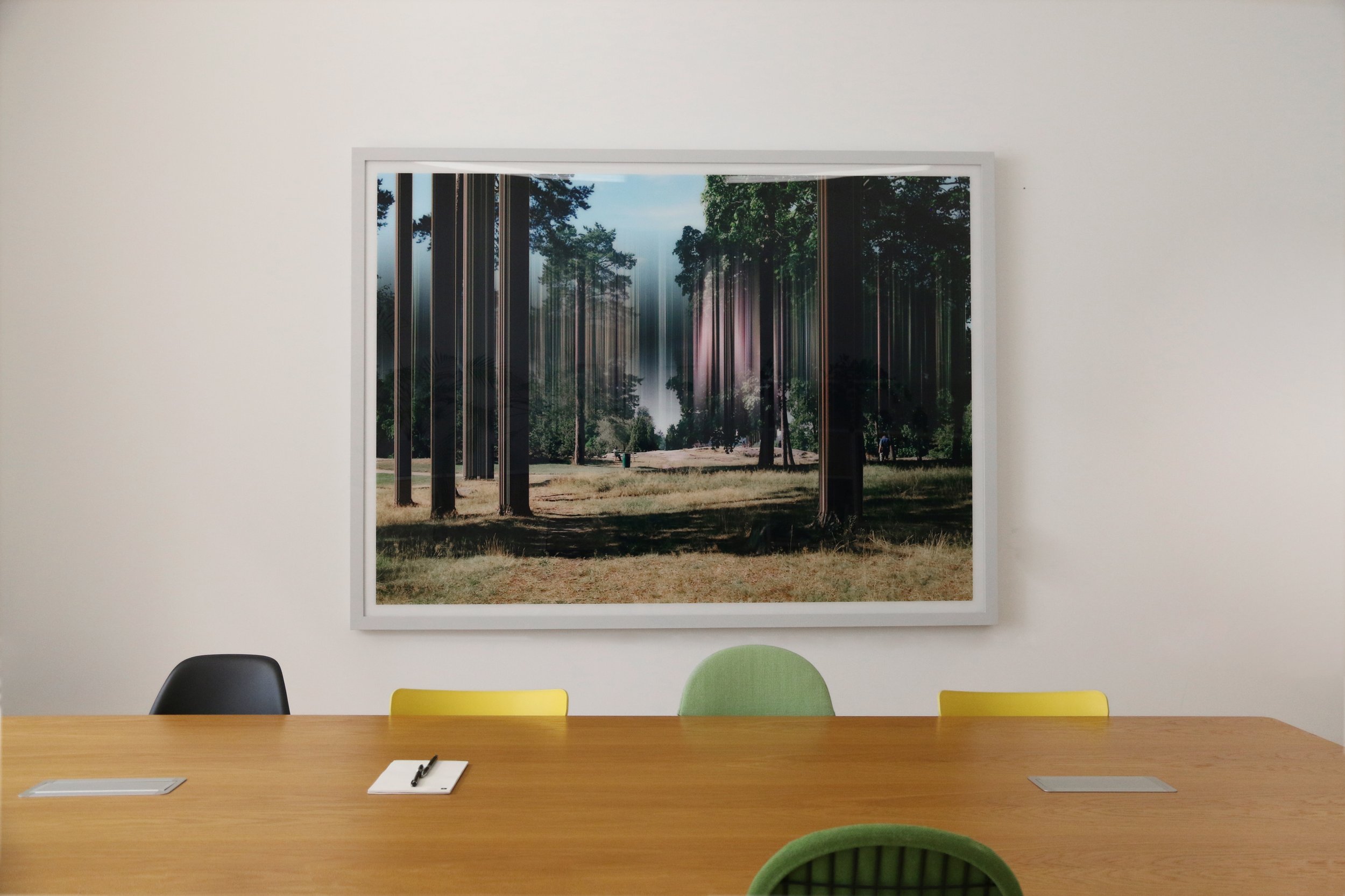 Zusätzlich zu den Ausstellungen in den Galerieräumen von Kunst & Denker werden in vielen Räumen Arbeiten verschiedener Künstler gezeigt. Die größte, permanente Arbeit wurde vom Aachener Künstler Tim Berresheim realisiert. In mehreren Workshops holte er sich bei Mitarbeitenden inhaltlichen Input für eine Arbeit, die er mit seinem Team zu einer Mixed-Media Großinstallation umsetzte.