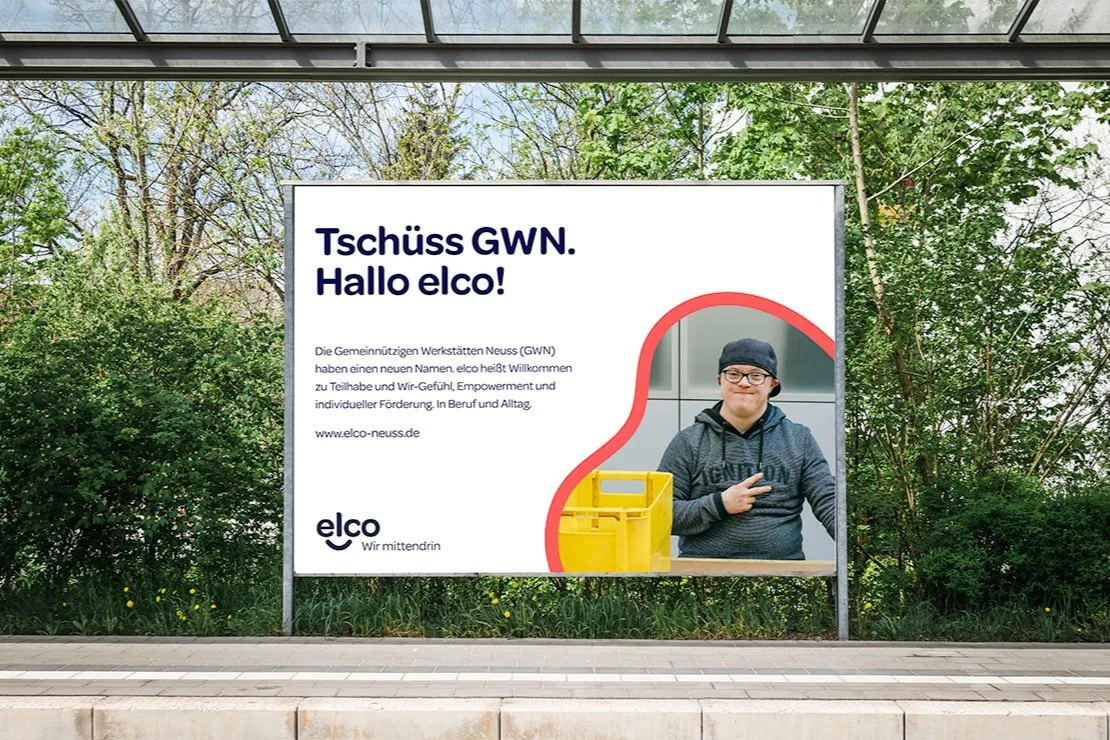 Lösung: Elco, der neue Name der GWN, ist die Mitte des englischen Wortes „Welcome“. Inklusion spielt in jeder einzelnen Kommunikationsmaßnahme die Hauptrolle: Im Magazin, das den neuen Auftritt begleitet, schreibt eine junge Frau darüber, was sie bewegt. Mit Hilfe eines Sprachcomputers, den sie mit den Augen steuert, denn sprechen kann sie nicht. Eine andere Mitarbeiterin spricht den Radiospot und weitere formulieren ihren Anspruch an Teilhabe mit klaren Worten im Video. Eine Ausstellung, die ihren Weg durch Neuss macht, wird mit Vorurteilen und Berührungsängsten aufgeräumt. Und so sind die vielfältigen Gesichter von elco in ganz Neuss präsent. Genau wie der Claim es sagt: „Wir mittendrin“. Der Appell an Außenstehende: „Hört uns zu!“. Denn Zuhören ist der erste Schritt zur Inklusion.