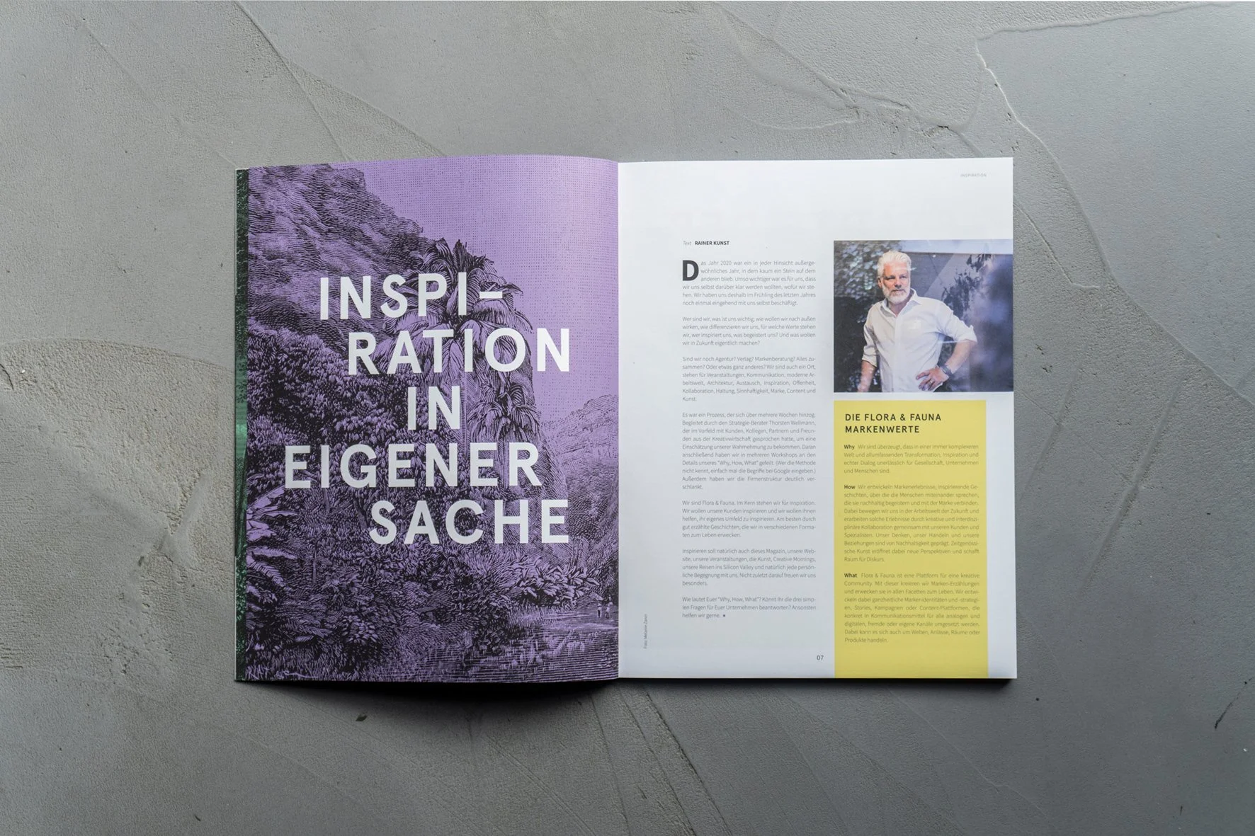 Idee: Ein Magazin rund um die Themen, die uns als Flora & Fauna beschäftigen: Die Zukunft der Arbeit, Nachhaltigkeit, Kunst, Kultur, Architektur und Design. Dabei blicken wir nicht nur nach innen, sondern weit in die Welt.